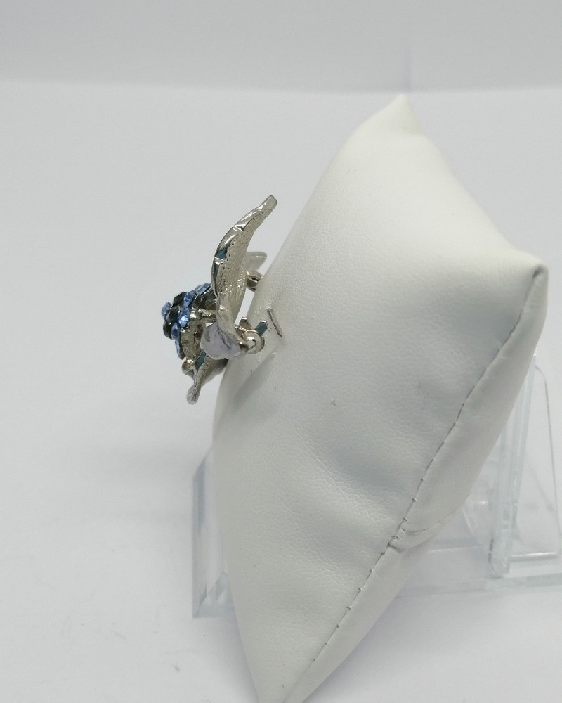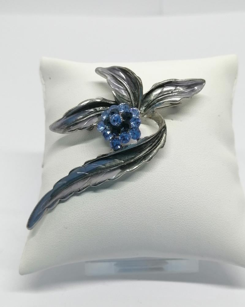 Broche monture en métal blanc façon chromé, longue feuilles et au centre une petite fleur composé de strass de deux couleur bleu différente, système fermoir à goupillon sécurisé, travail Européen vers 1970-80.