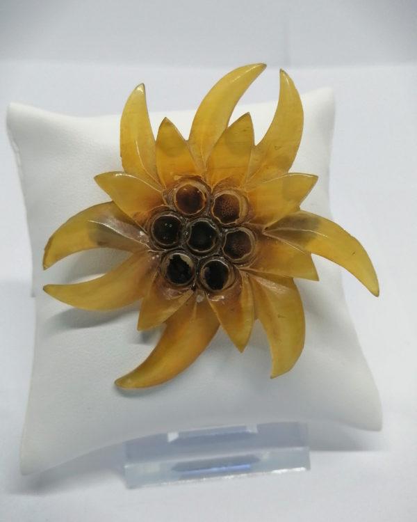 Broche monture sans doute en corne animale, représentant une grande fleur d'edelweiss, peinte au centre, système fermoir simple sans sécurité, normal pour l'époque, travail Européen vers 1900, Art Nouveau.