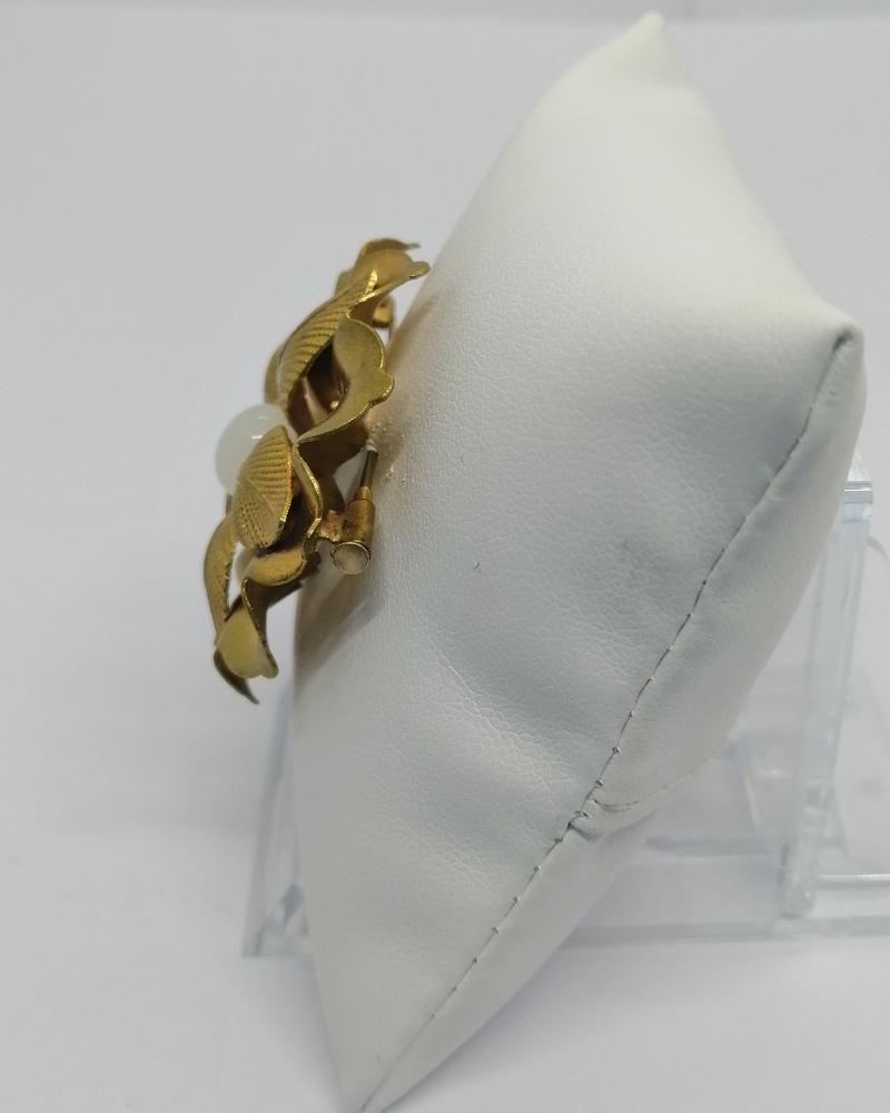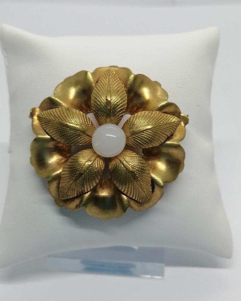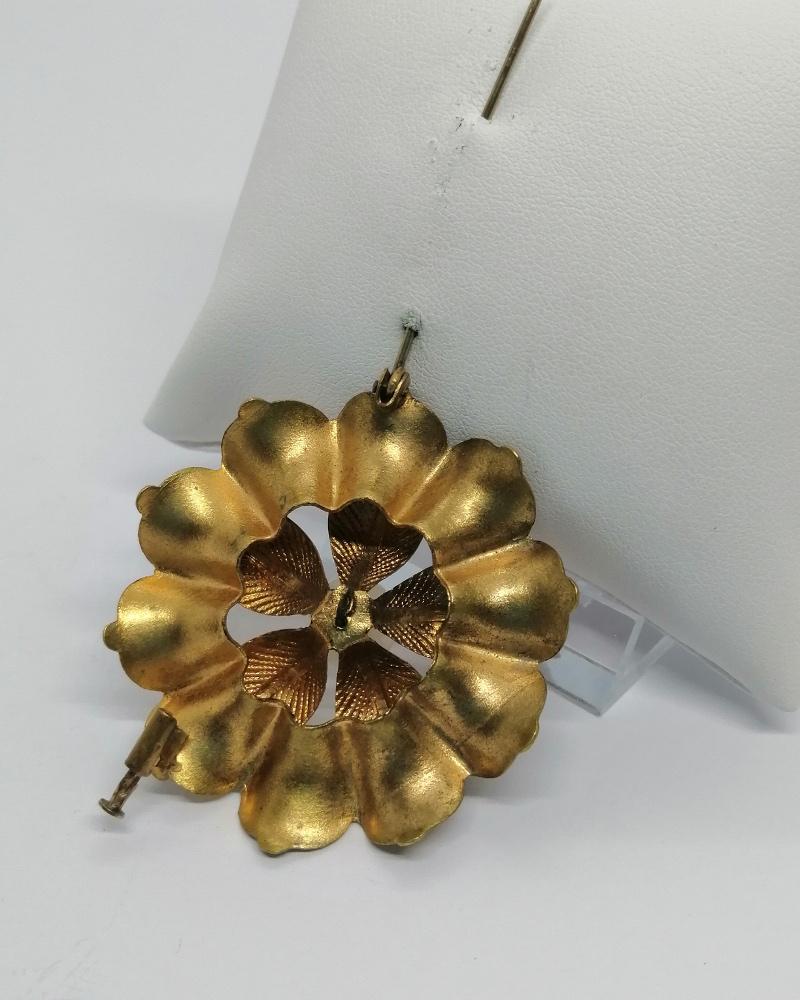 Broche monture en laiton jaune, ajourée, en forme de fleur en repoussé et travaillé en partie, avec au centre, un bouton de verre blanc, système fermoir à pompe sécurisé, travail Européen vers 1920.