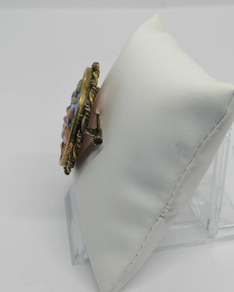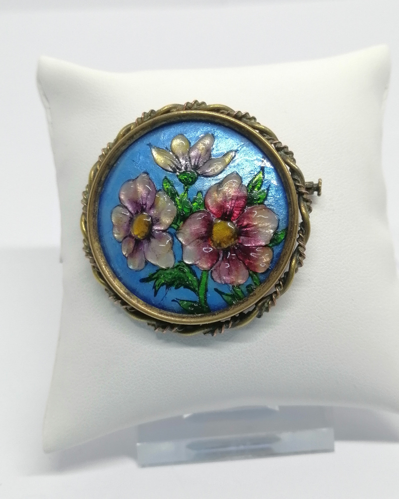 Broche laiton jaune, émail sur cuivre, motif floral, Limoges, 1900-20.