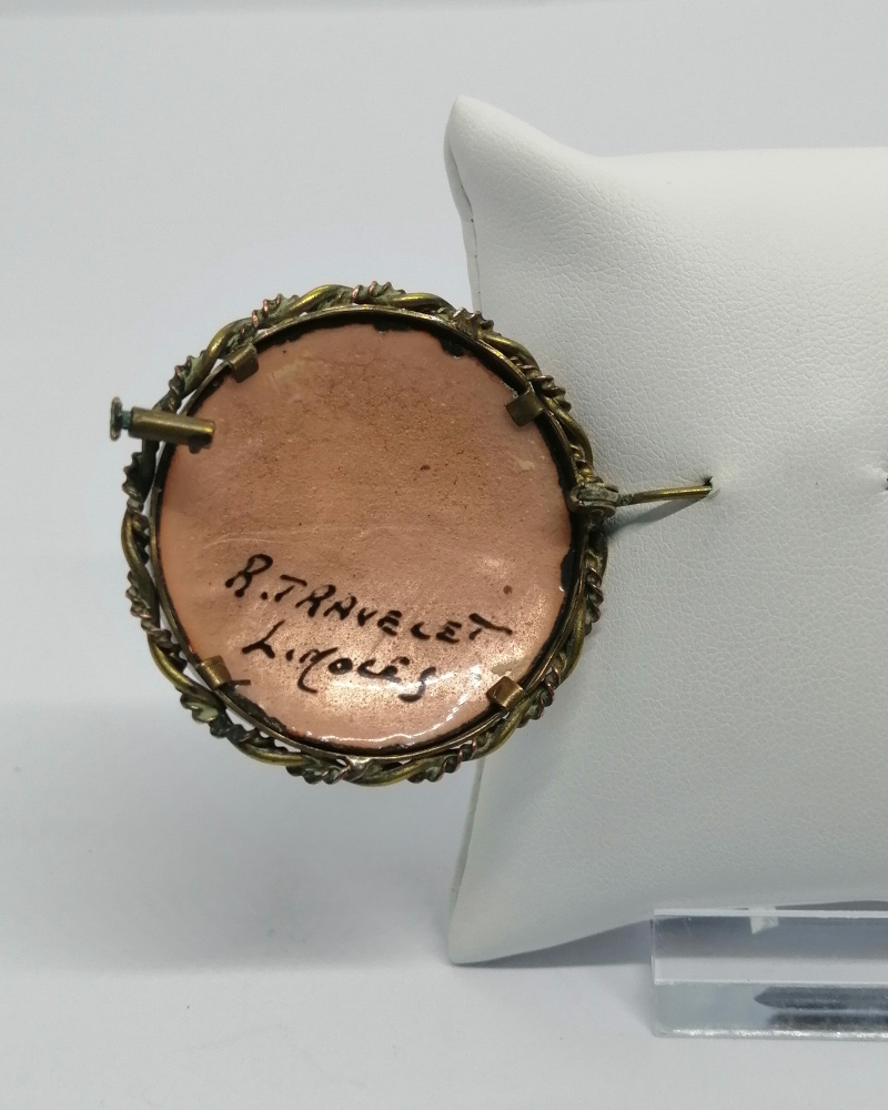 Broche monture en laiton jaune, de forme ronde avec fil tourné autour, en sertie clos un émail sur cuivre, représentant des fleurs et feuilles sur fond bleu ciel, signé R. Travelet Limoges, système fermoir à pompe sécurisé, travail Français vers 1900-20, Art Nouveau.