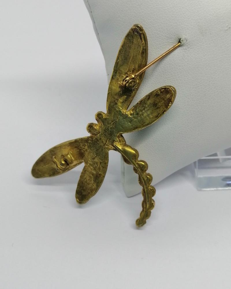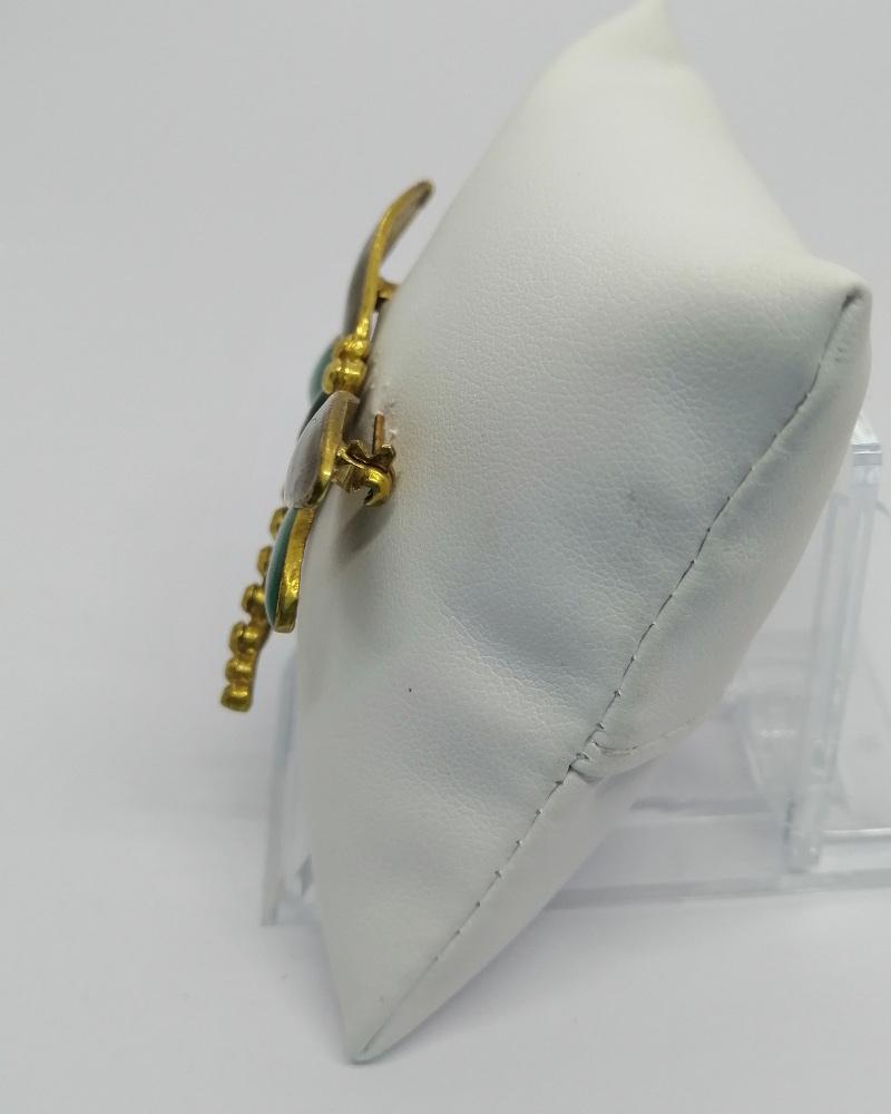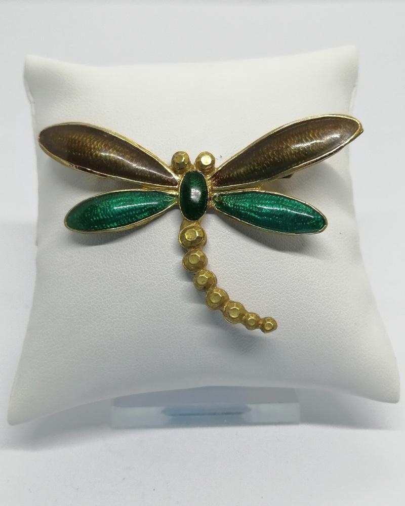 Broche monture en laiton jaune, représentant une belle libellule, ailes déployées, dont celles-ci sont en émail guilloché de couleur brun et vert, système fermoir goupillon de sécurité, travail Européen, vers 1940-50.