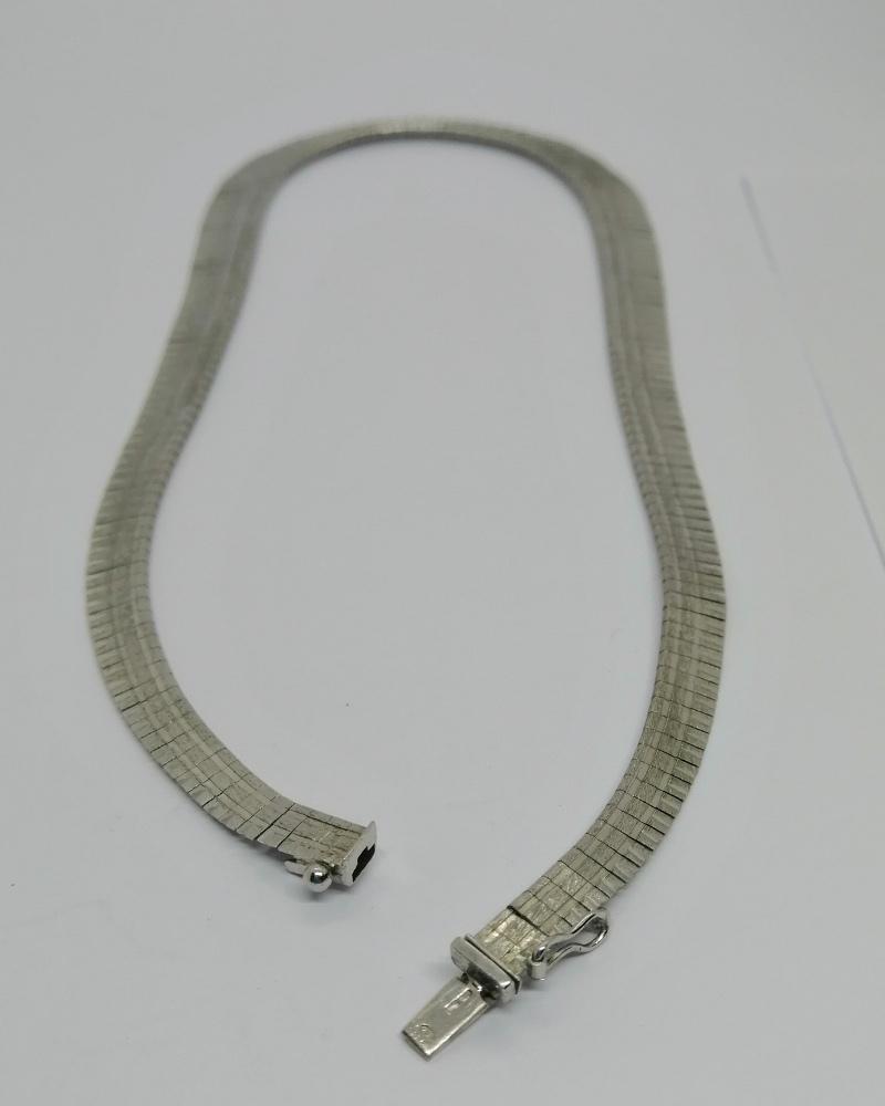 Collier monture en argent massif, modèle vintage, avec maille plate en chute avec palmettes découpées, avec en fond un travail façon brossé, et d'autres parties et motifs en poli pour le contraste, système fermoir à cliquet et huit de sécurité, travail Européen vers 1950-60.