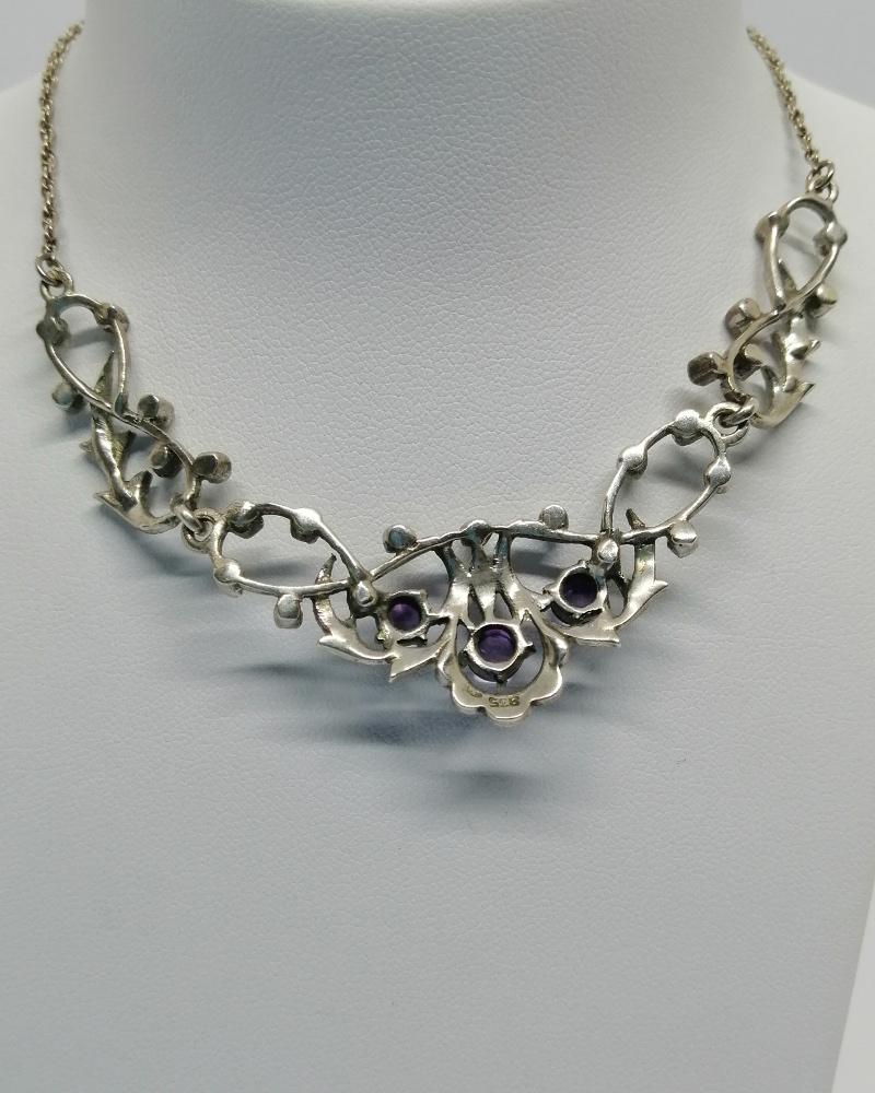 Collier argent, motifs ajourés et galbés, pavage marcasites et sertie de cabochons d’améthystes, vers 1920.