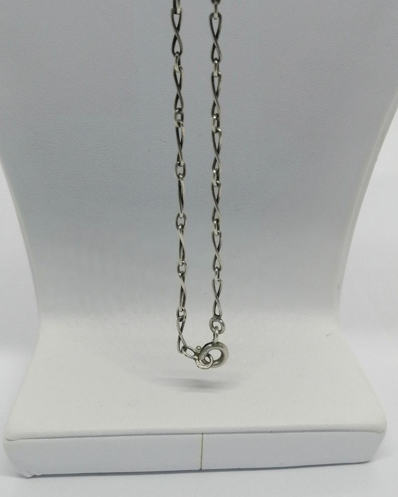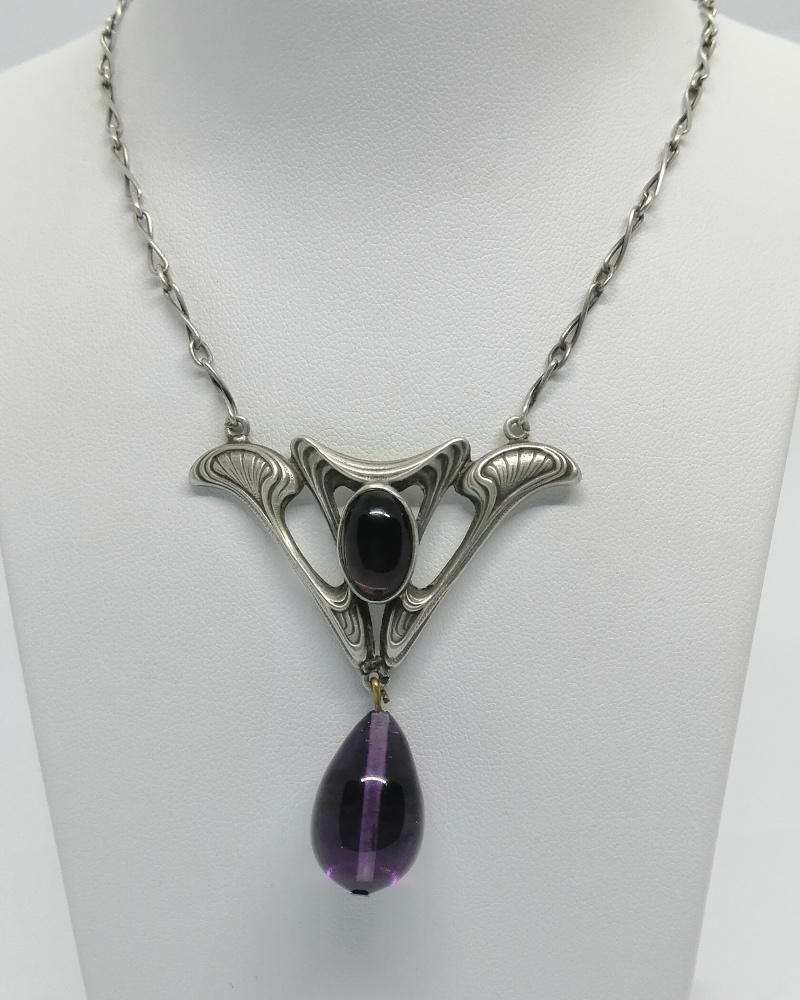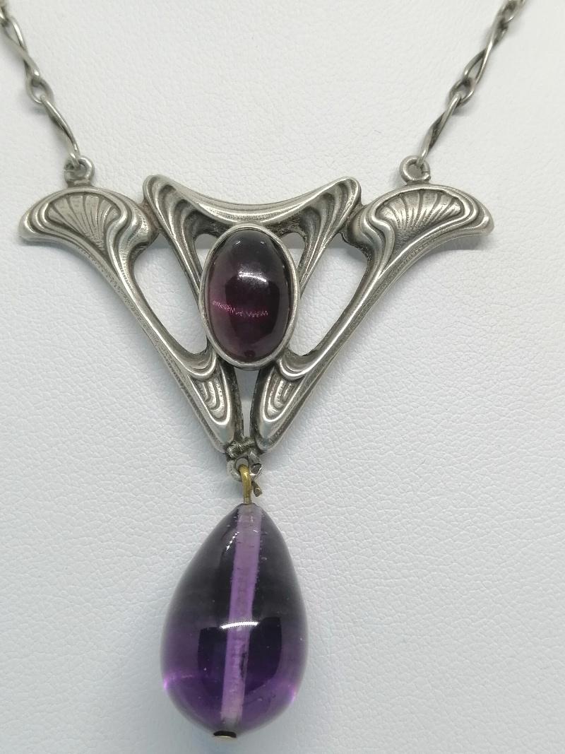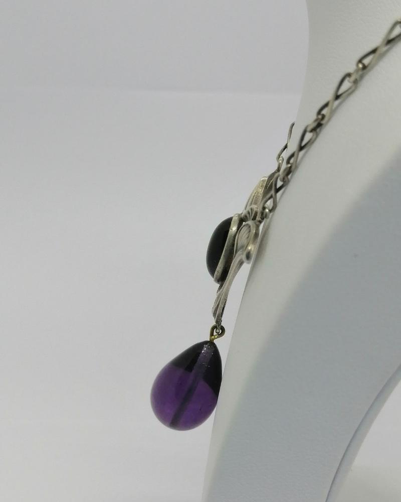 Collier monture en argent massif, motif végétal de forme typique de l'art nouveau, légèrement galbé et ajouré, matifié, avec au centre en sertie clos un cabochon de pâte de verre de couleur améthyste, en pampille grosse goutte en pâte de verre assortis à celui du haut, chaîne maille ancienne de cette même époque, fermoir anneau ressort, travail Français , Parisien vers 1900, Art Nouveau, peu courant sur le marché.