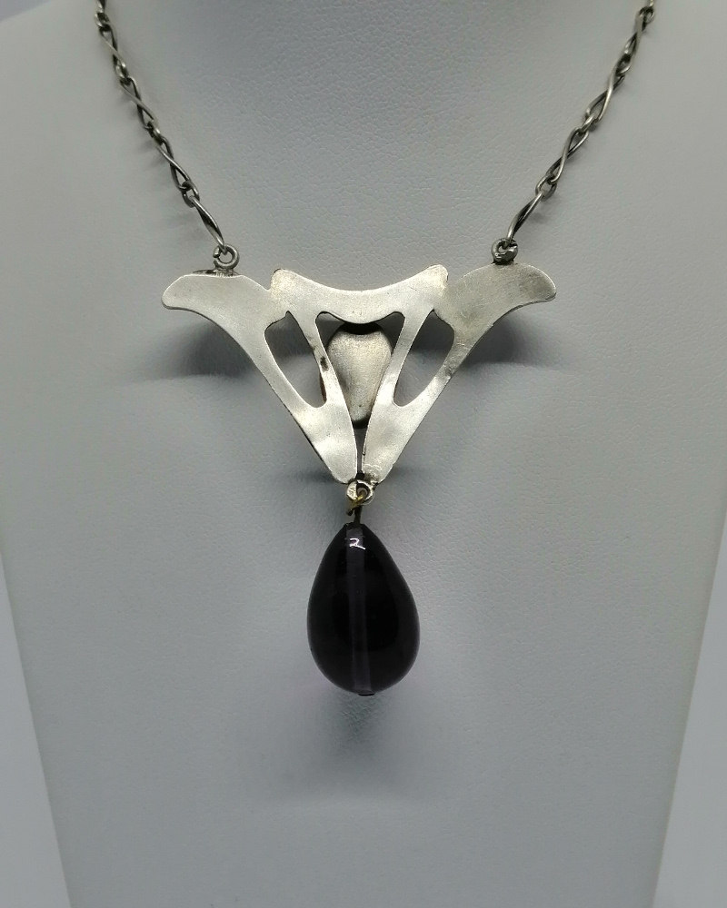 Collier en argent, avec motif typique de l’art nouveau et pâte de verre couleur améthyste, 1900.