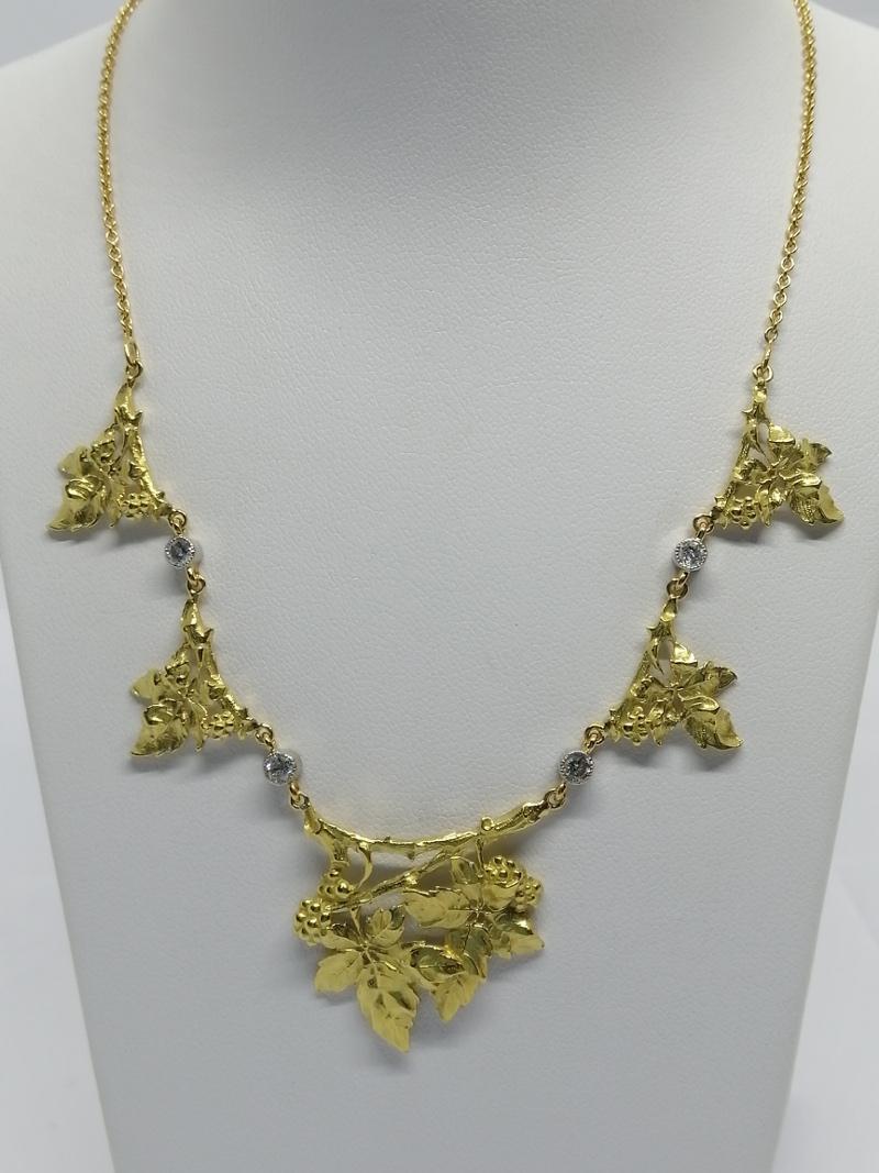 Collier monture en or jaune, et sertie diamants en gris, composé de cinq éléments mobiles, travail façon brossé, celui du centre plus grand et légèrement incurvé, représentant des feuilles de lierre et ses fruits, entre ses maillons sont intercalés en sertie clos perlé, quatre diamants taillés de différentes tailles pour environ 0,45ct, chaîne maille forçat simple, avec système fermoir anneau ressort, magnifique bijou en détails dans la gravure, rare modèle d'époque Art Nouveau Français, vers 1880-1900.