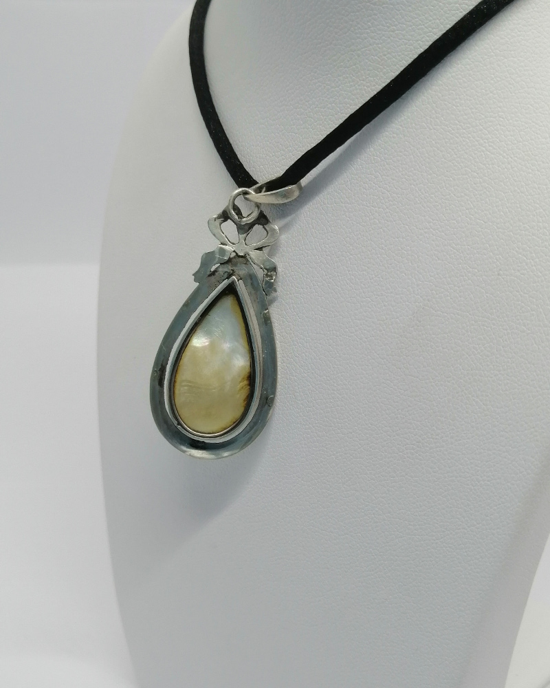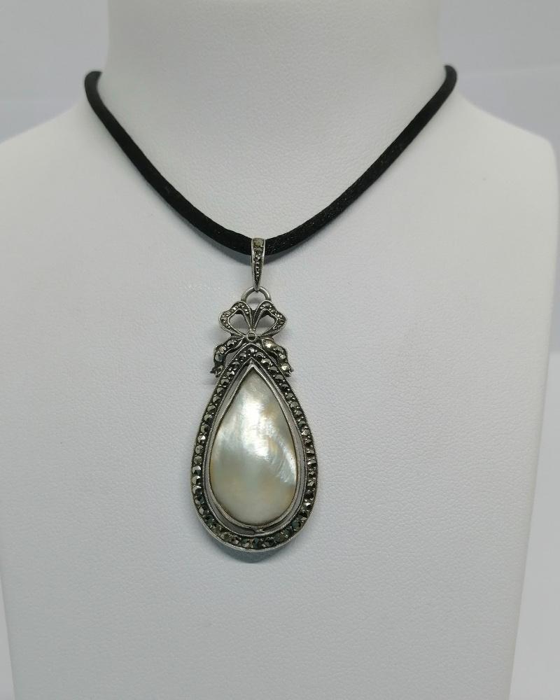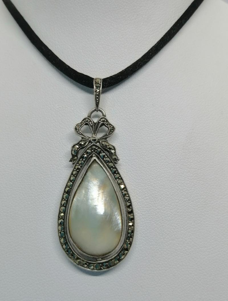 Pendentif monture en argent massif, ajouré en forme d'oeuf avec son noeud, au centre une nacre ou coquillage de même forme, tout autour un pavage en sertie grains de marcasites naturelles et facettées, le tout avec finition frise perlée, bélière assortie, superbe travail sans doute Allemand vers 1920, cordelette non fournie.