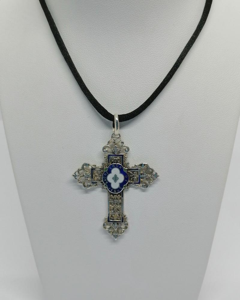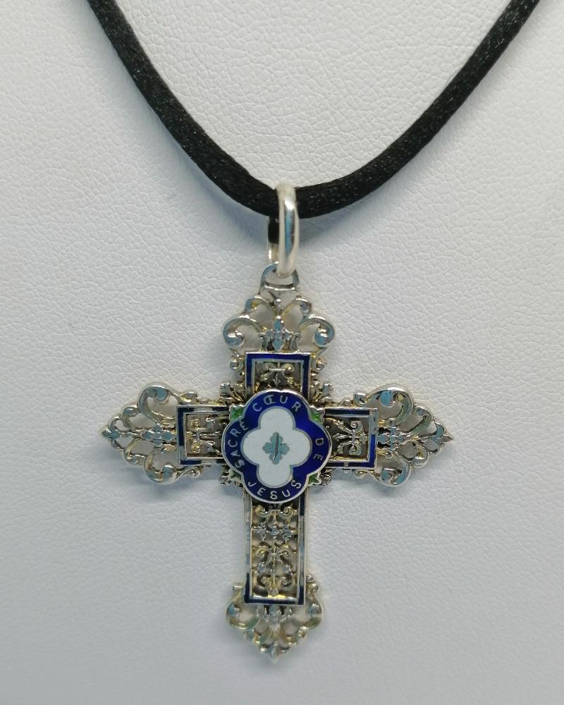 Pendentif monture en argent massif, croix en vermeil, entièrement ajourée, avec des parties émaillées en bleu, blanc et vert, avec une inscription "Sacré coeur de Jésus", travail Français vers 1900-20, cordelette non-fournie.
