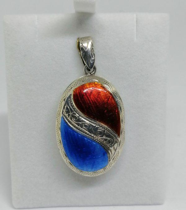 Pendentif en argent de forme ovale avec bélière travaillée, sur le dessus travail d'émail guilloché bleu et rouge sur le revers travail de ciselures de feuillages et rinceaux, peu courant sur le marché, travail d'époque 1920-30.