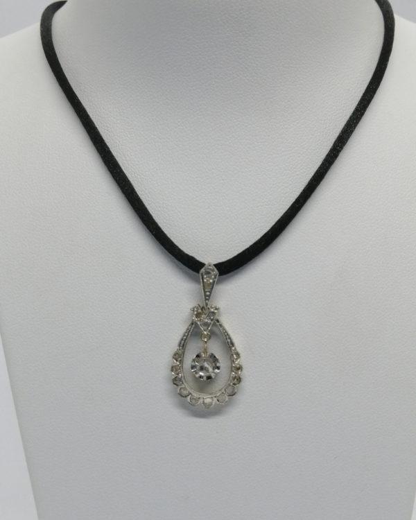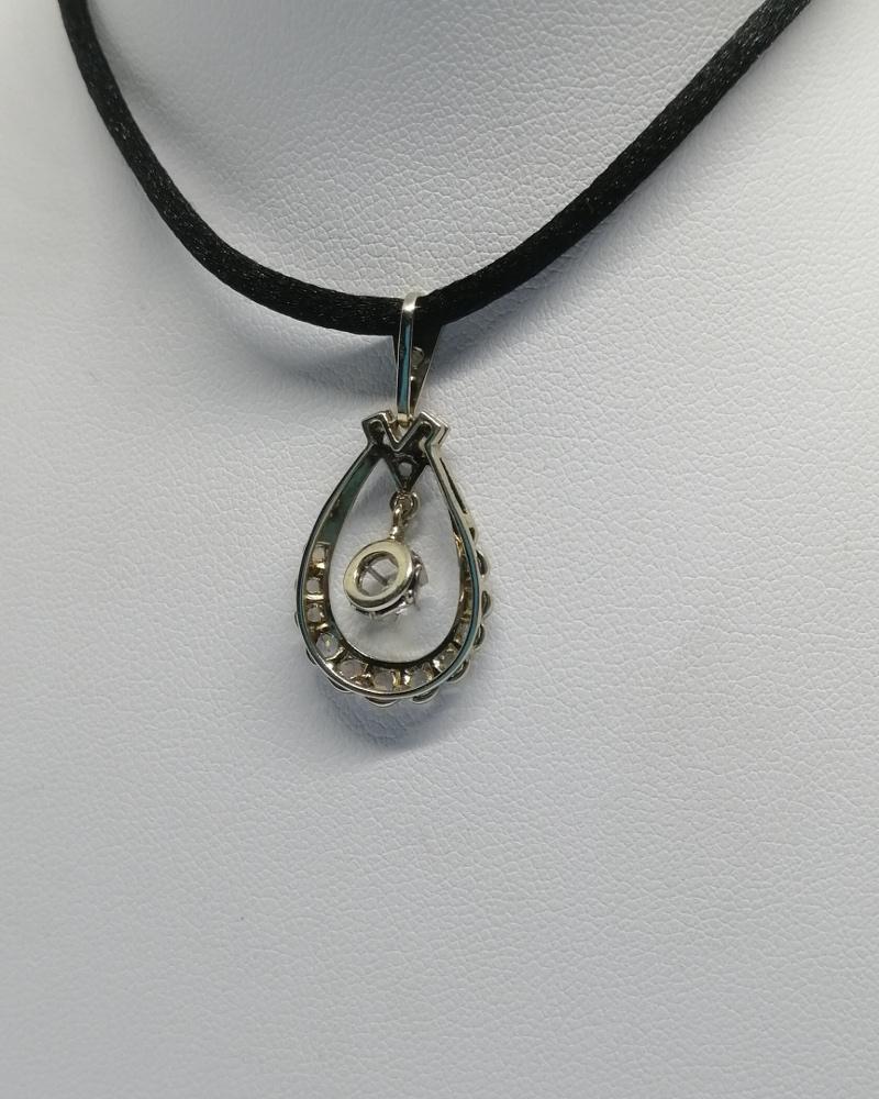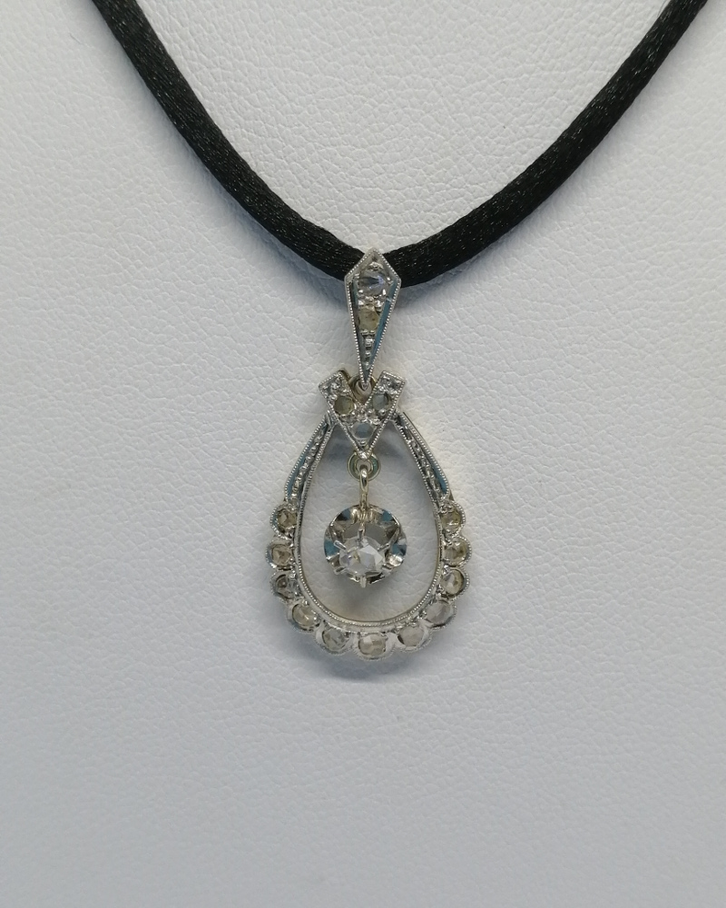 Pendentif monture en or gris et sertie en platine, en forme de goutte ajourée autour, avec pampille centrale mobile, sur celle-ci en sertie griffes une rose de diamants facettée, tout autour un pavage en sertie grains de roses de diamants facettées, le tout avec une finition de frises perlées, bélière en triangle assortie, travail Français Art Déco vers 1925-30, cordelette non-fournie.