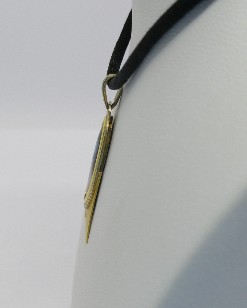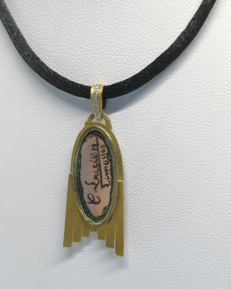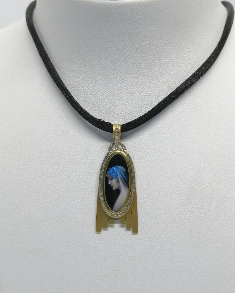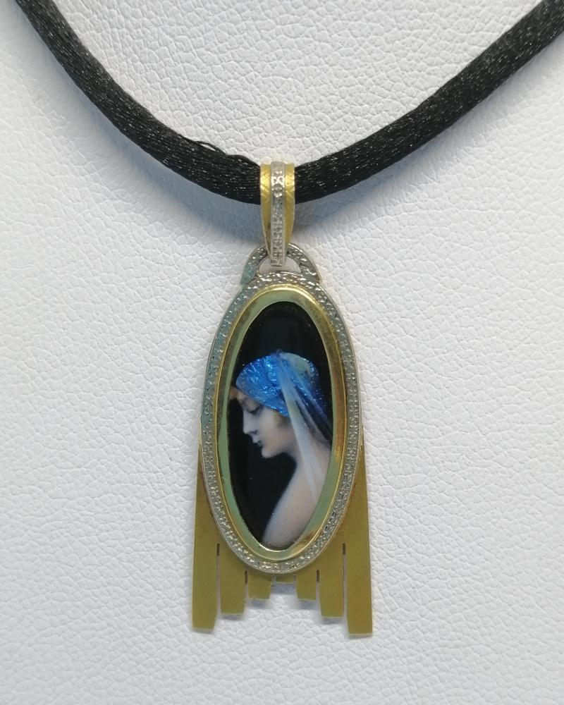 Pendentif monture en or jaune, de forme typique de l'art déco, avec or matifié et découpe, liseré ovale en or gris faisant frise décorative, au centre une superbe miniature d'émail sur cuivre, "Femme au voile bleu", signé C. Lucien, à Limoges, bélière en triangle assortie, rare modèle ayant la particularité d'être de forme géométrique d'époque Art Déco vers 1925-30, travail Français, cordelette non-fournie.