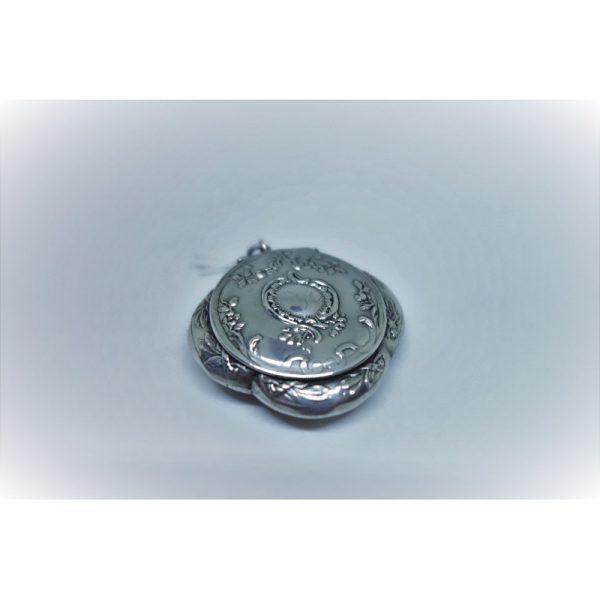 Boîte argent de forme quadrilobé, intérieur en vermeil avec petite glace, motifs de fleurs, et au centre un cartouche permettant de personnalisé la pièce, fermeture par pression sur le couvercle, travail français d'époque Art Nouveau vers 1900.