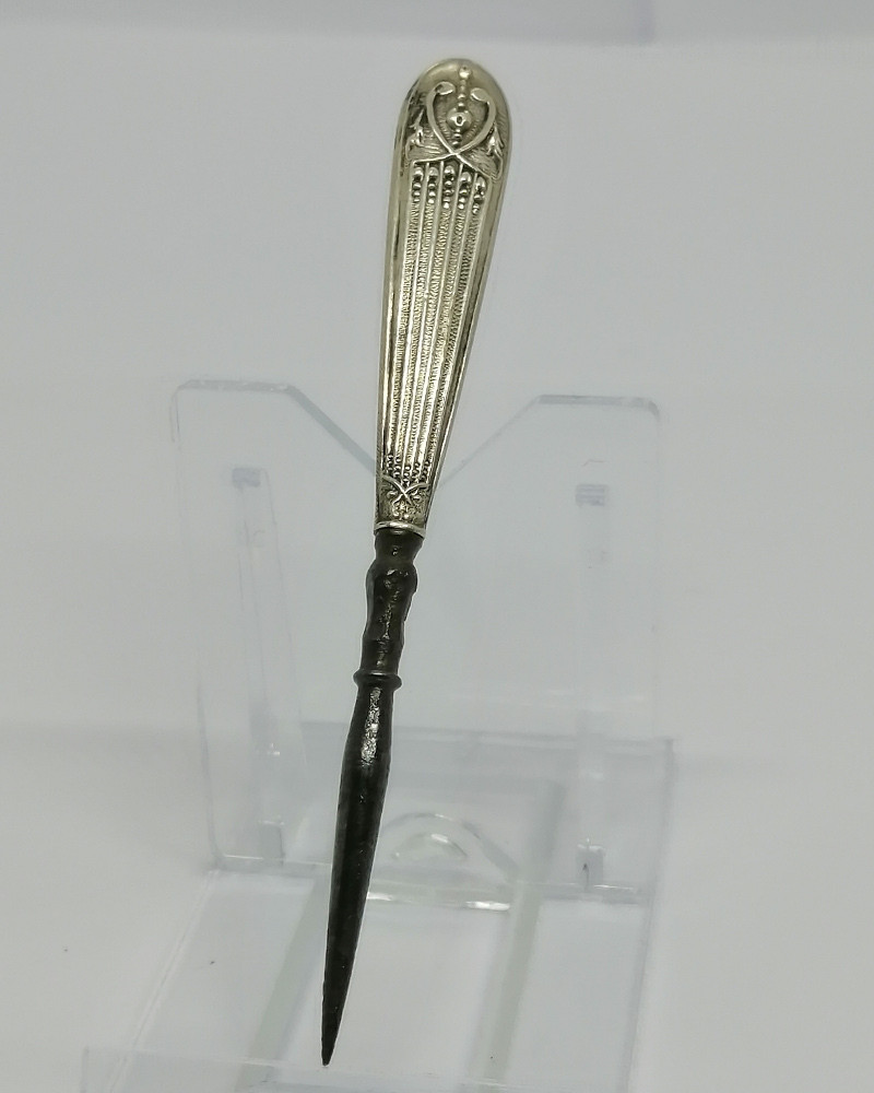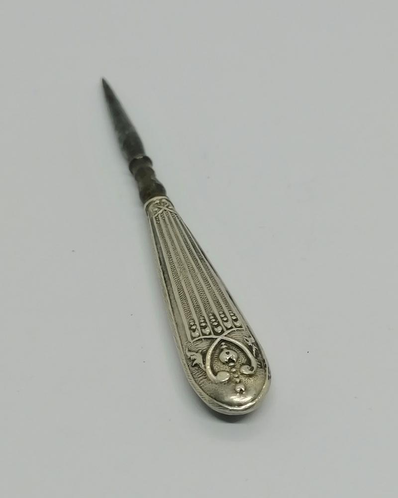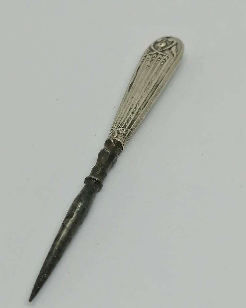 Poinçon de broderie, manche argent massif fourré, pointe en acier, modèle aux stries et frise végétale, travail Français, Parisien, vers 1900-20.