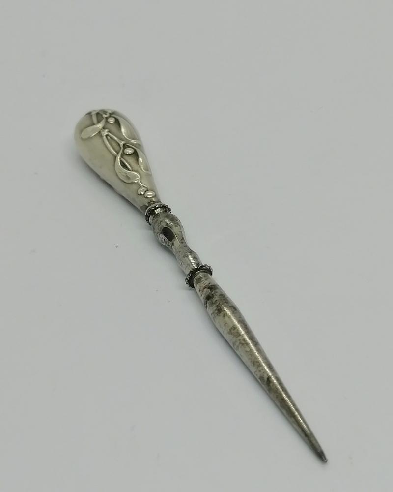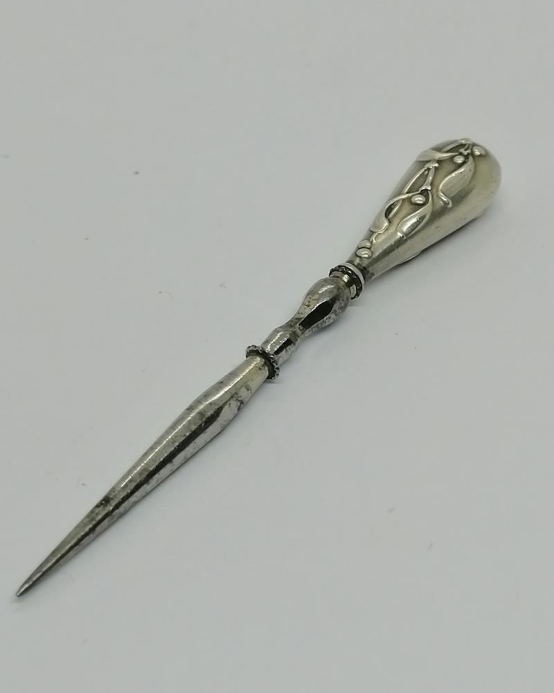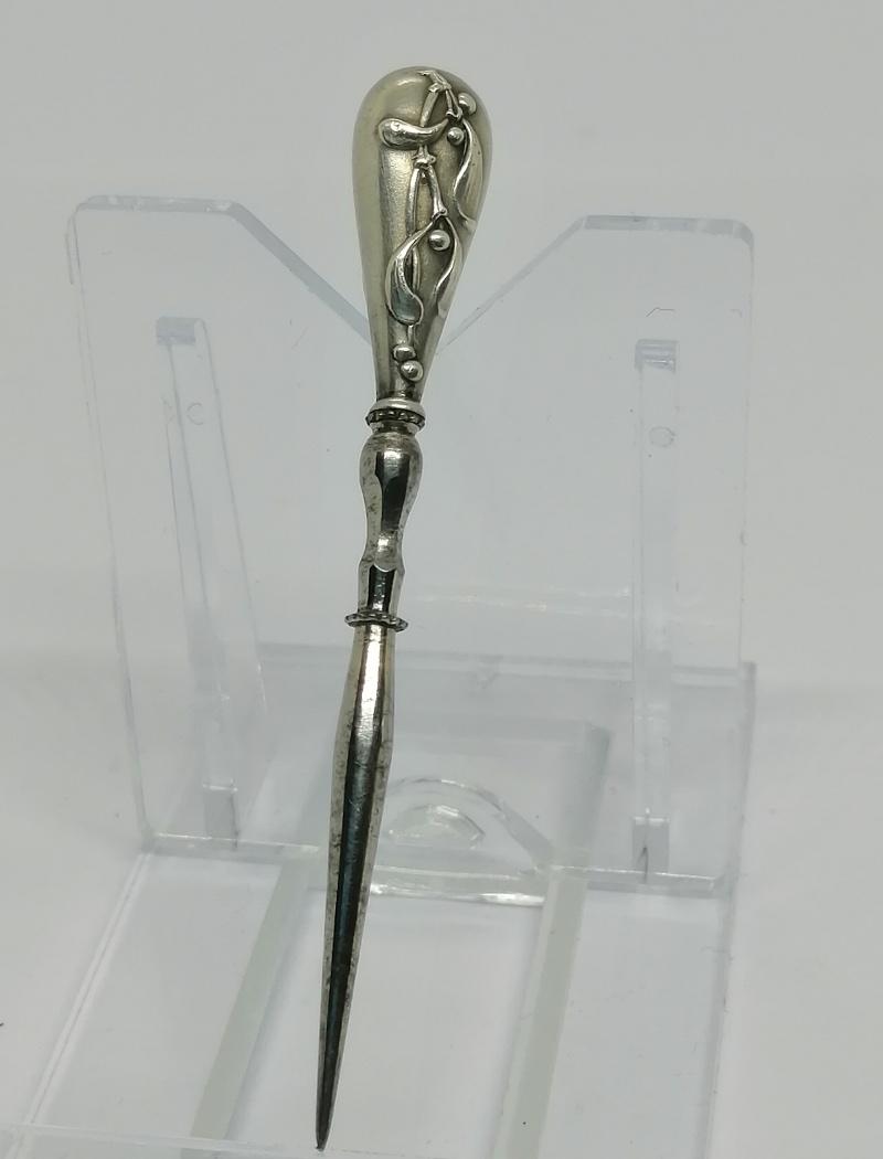 Poinçon de broderie, manche en argent massif fourré, pointe en acier chromé, modèle au gui, travail Français Parisien, art nouveau vers 1900.