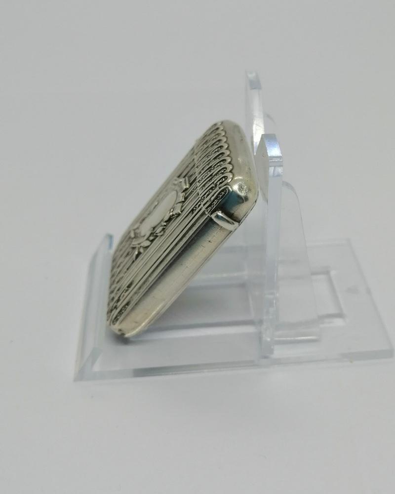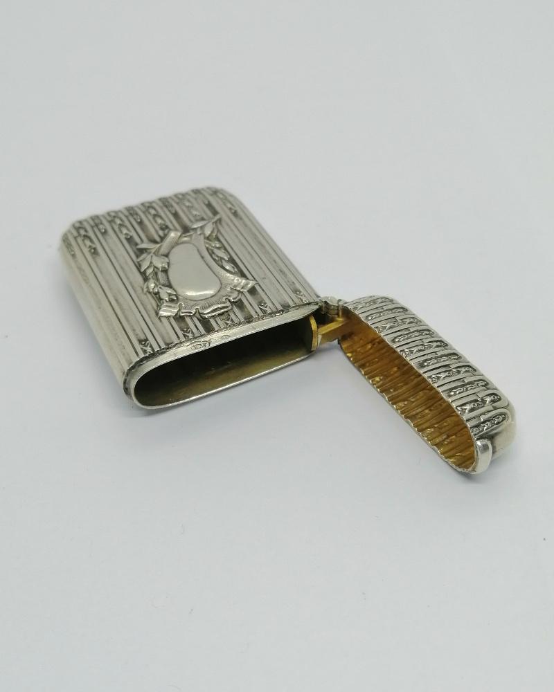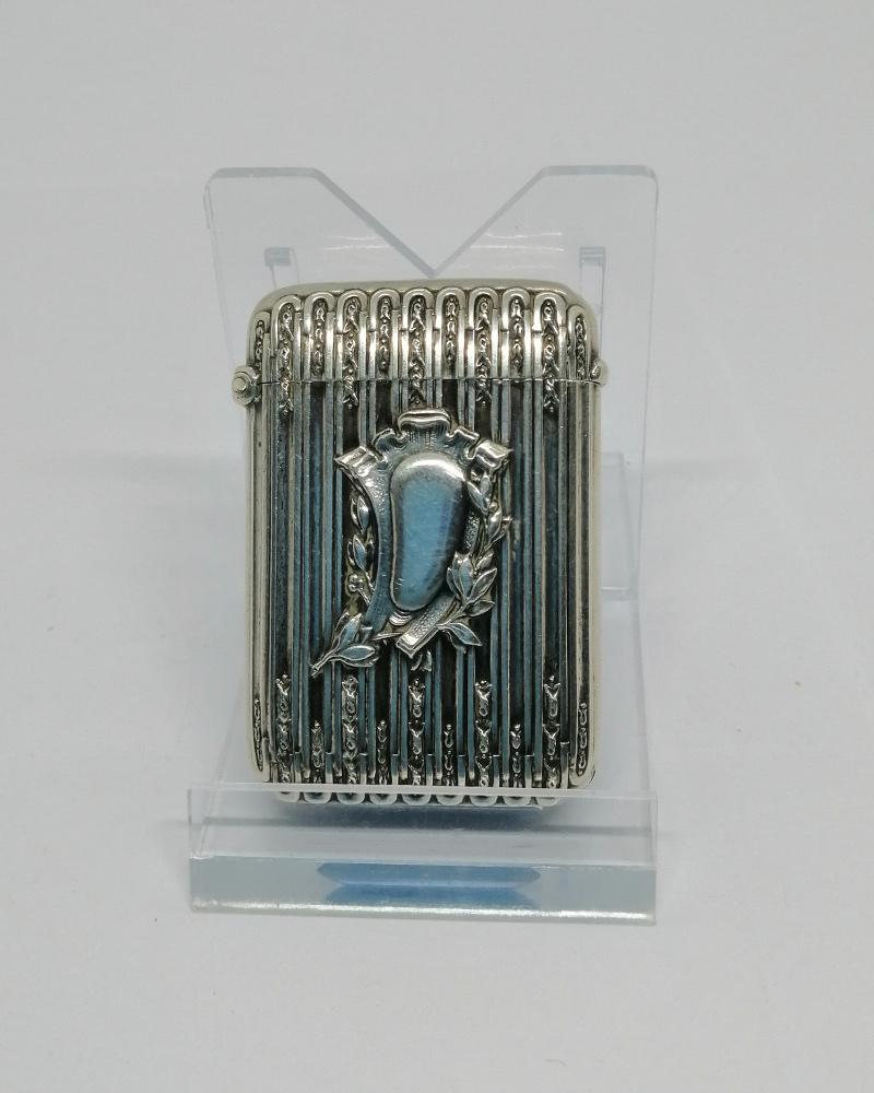 Pyrogène monture argent massif, porte-allumettes, modèle aux stries et fins rinceaux de chaque côté, à l'avant un cartouche vierge, restant à graver, entouré de feuillages, intérieur vermeil, se ferme par pression assisté par languette interne, en-dessous grattoir, travail Français Parisien, vers 1900-20.